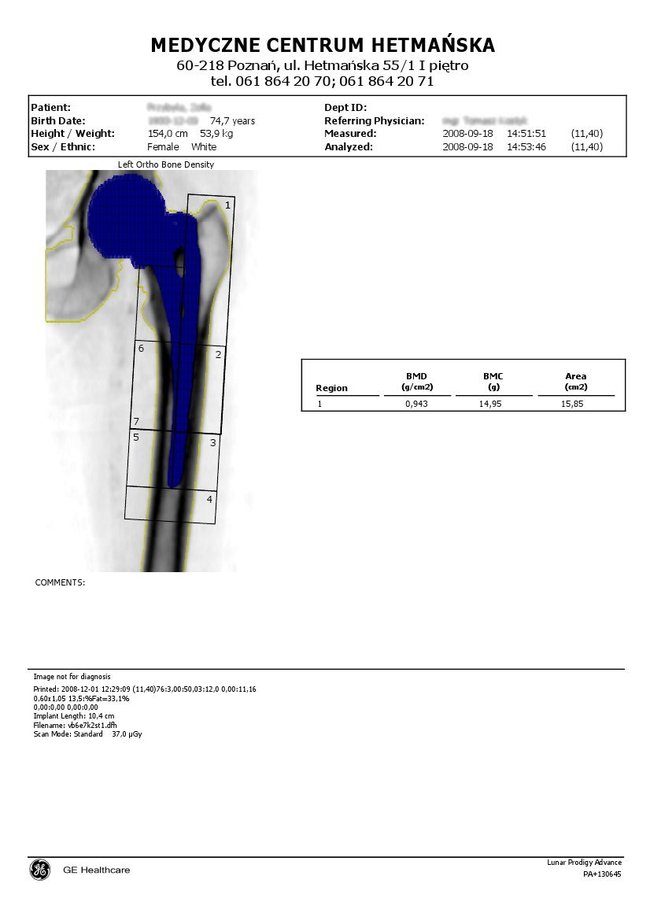 Wysoce specjalistyczna procedura, przeznaczona dla pacjentów po endoprotezoplastyce stawów biodrowych, umożliwiająca analizę gęstości mineralnej kości (ang. bone mineral density - BMD) wokół trzpienia jakiejkolwiek endoprotezy.