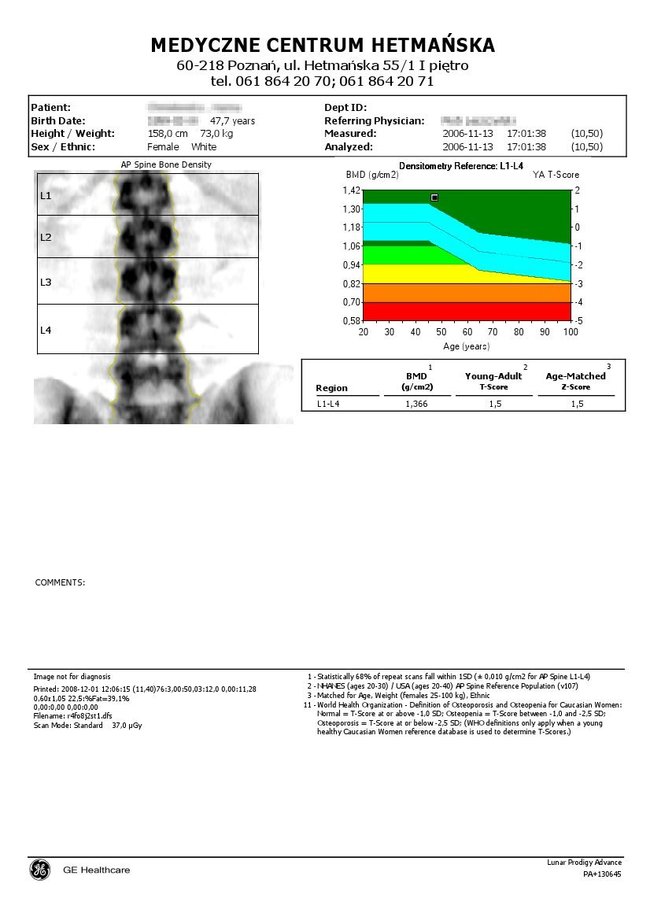 DENSYTOMETRIA KRĘGOSŁUPA LĘDŹWIOWEGO Standardowo zaleca się wykonywanie takich oznaczeń co 12 miesięcy, na tym samym aparacie , w tej samej lokalizacji oraz najlepiej przy tej samej osobie obsługującej urządzenie (najmniejszy błąd pomiarowy).