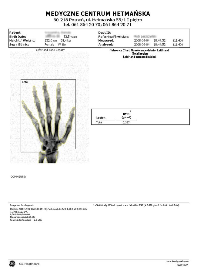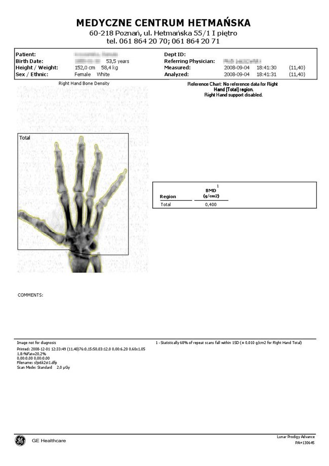 Wysoce specjalistyczna procedura, przeznaczona dla pacjentów w diagnostyce bólów i obrzęków drobnych stawów rąk w przebiegu różnych procesów zapalnych. Umożliwia monitorowanie zmian gęstości mineralnej kości rąk (ang. bone mineral density - BMD).