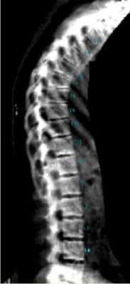 Podczas jednego badania przeprowadzony zostaje pomiar wysokości oraz ocena deformacji trzonów kręgowych w części piersiowej i lędźwiowej kręgosłupa (T4 – L4).