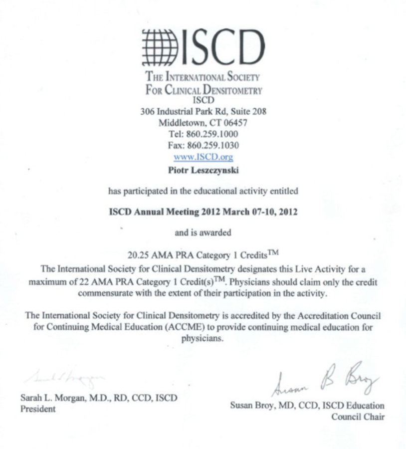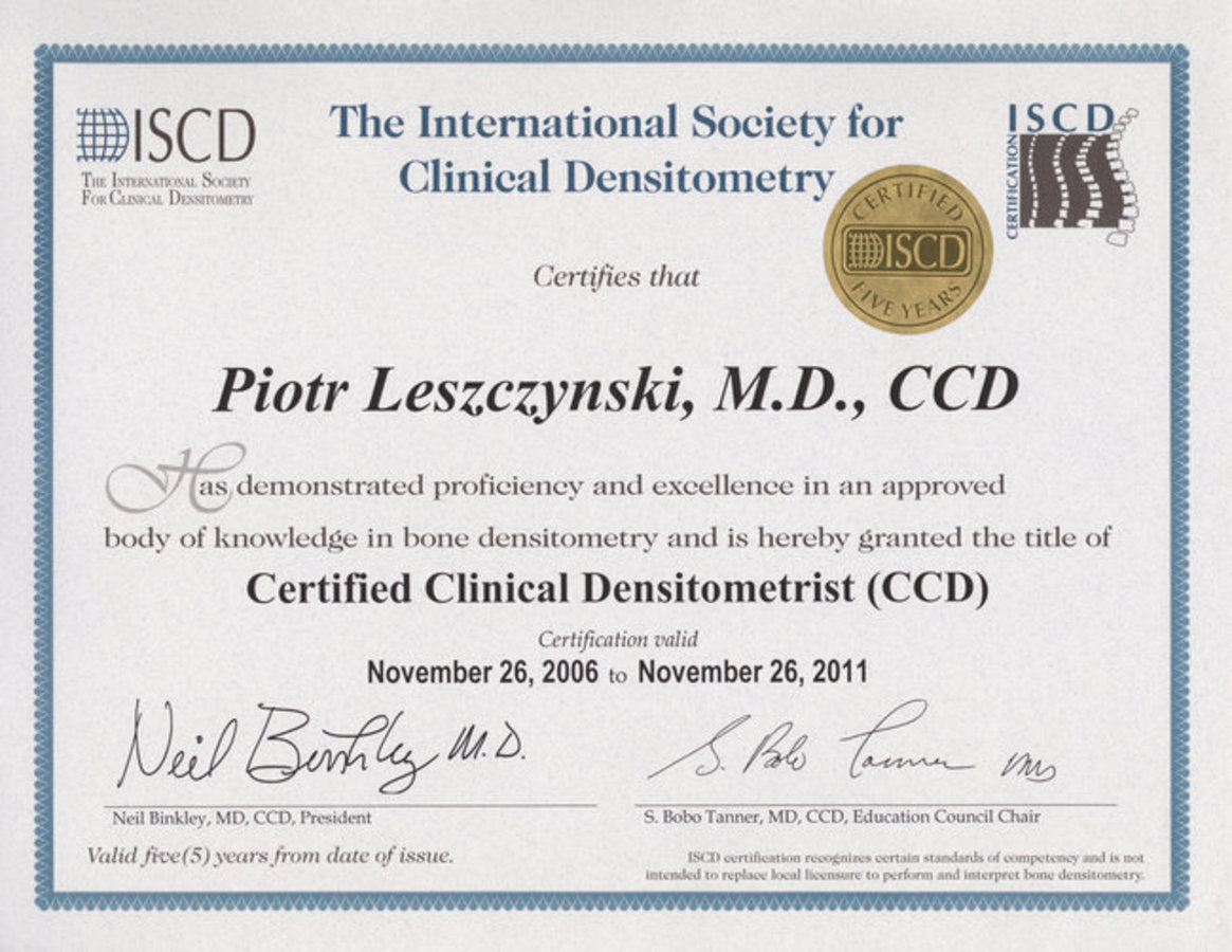 Lekarze w Medycznym Centrum Hetmańska oceniający badanie densytometryczne, a także leczący osteoporozę są nieustannie szkoleni z zakresu chorób metabolicznych kości, w tym osteoporozy i posiadają aktualny CERTYFIKAT MIĘDZYNARODOWEGO STOWARZYSZENIA DENSYTOMETRII KLINICZNEJ (ISCD).